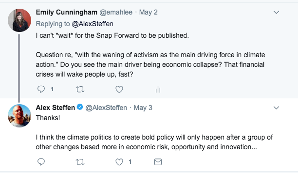 Thanks for all these recommendations. I guess where I was coming from came out of a conversation with @AlexSteffen about what will be the main driver of climate action. I have much to learn and am trying to absorb as much as I can. https://twitter.com/emahlee/status/1124201616184229888 …pic.twitter.com/i8qbpjns1c