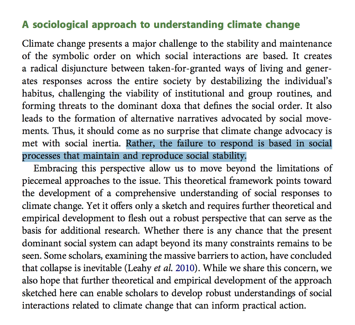 "thus it should come as no surprise that climate change advocacy is met with social inertia. Rather, the failure to respond is based in social processes that maintain and reproduce social stability." ~@RBrulle and Kari Norgaard (I was a sociology major as an undergrad.) 2/2