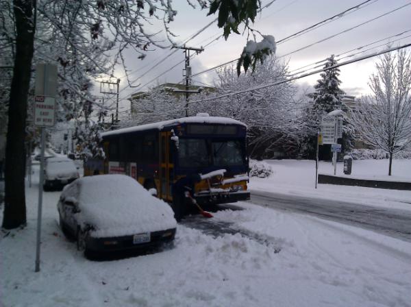 Bus stuck on Pine and 13th #seasnow cc @jseattlepic.twitter.com/Ytv0Xi9A