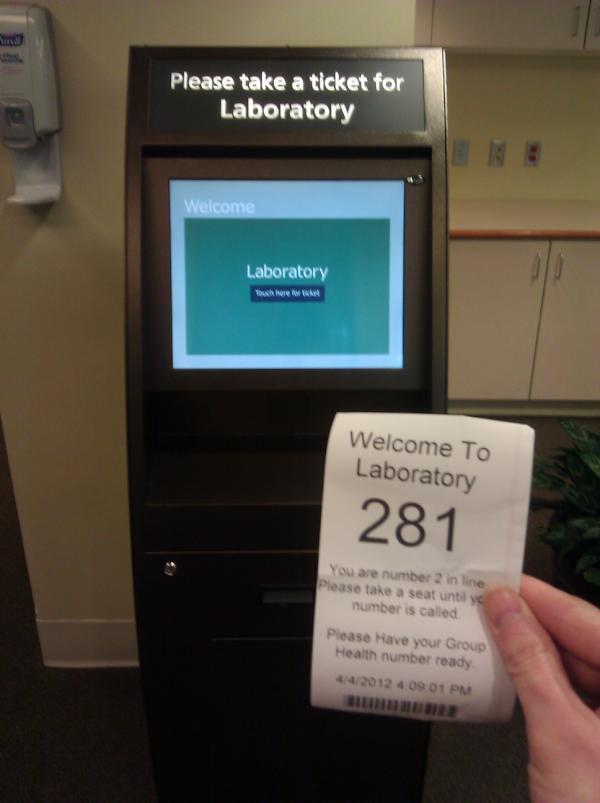 Interesting: Group Health has a ticket kiosk for their lab. First time using one at a medical facility. #imSickpic.twitter.com/OCLzVzED