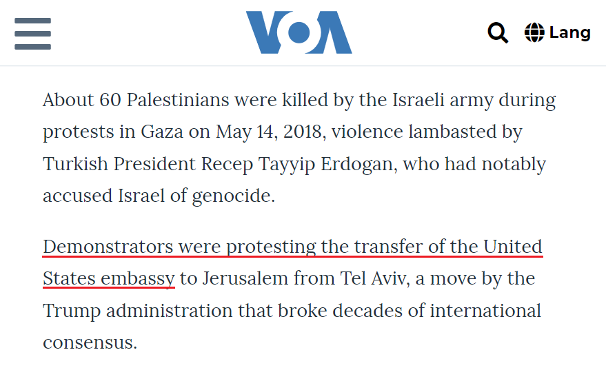 Even now, Hamas' ploy of moving the protest a day up to coincide with the embassy move bears fruit. The violent protests, called "The Great March of Return", were chiefly about claiming land in Israeli territory. But media outlets repeatedly disregard all that.https://twitter.com/HonestReporting/status/1354013535240650752 …