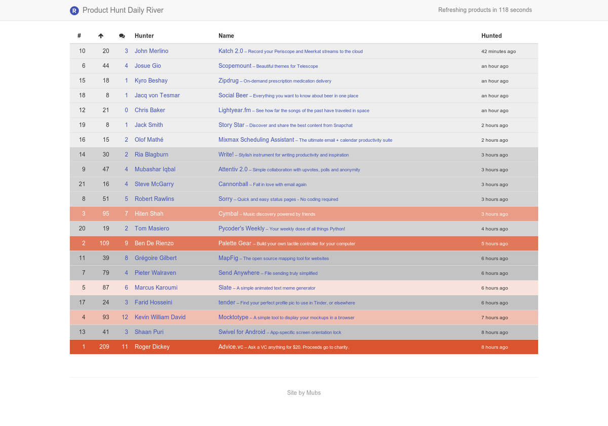 Product Hunt Daily River: A feed of the day's top hunts in chronological order http://www.producthunt.com/tech/product-hunt-daily-river …pic.twitter.com/YszMXmJ6z8