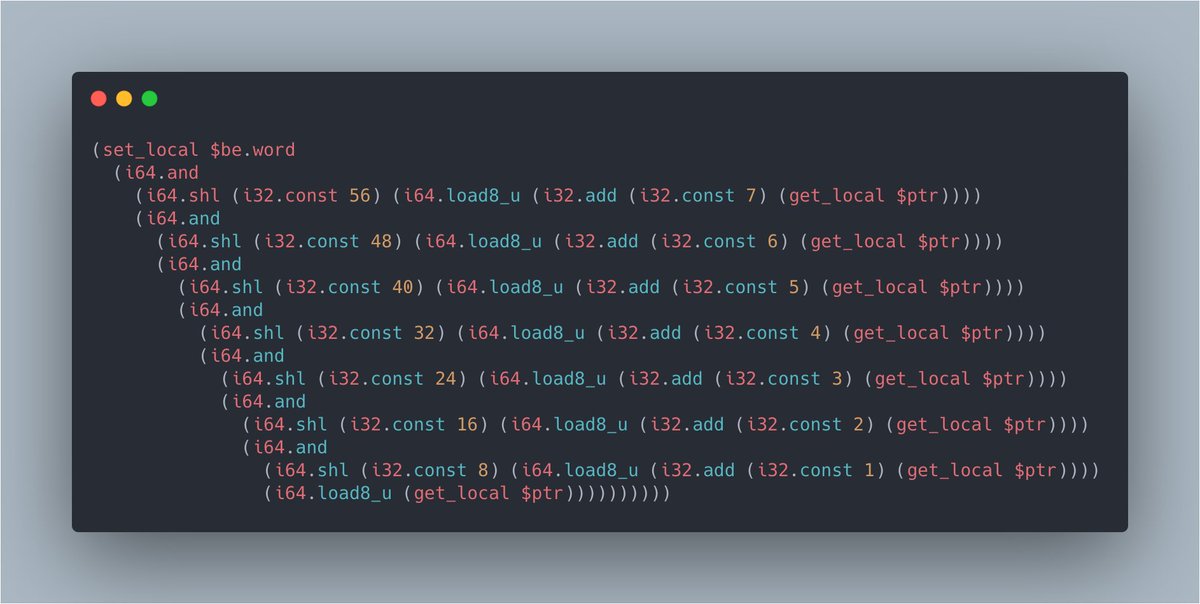 Nice little trick for WAT (WebAssembly Text Format); You can mix S-expression and stack formats. Eg. this example with loading a 64-bit word as Big Endian in C, pure S-expr and mixed format. Makes it much more readable imopic.twitter.com/cB2BMOuVHC