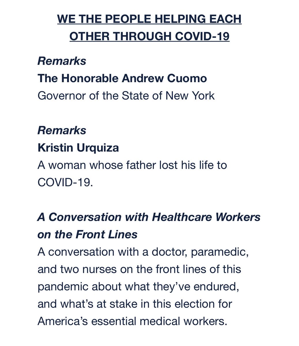 Speakers this evening include: @MichelleObama @BernieSanders @NYGovCuomo @WhipClyburn @JohnKasich @GovWhitmer @EvaLongoria
