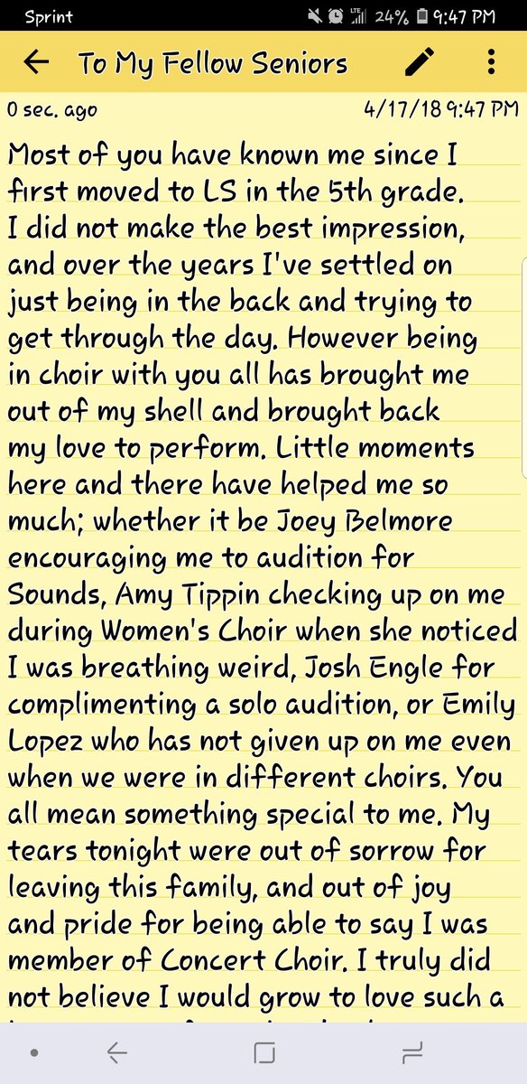 I'm slowly realizing that senior night is coming up in Parade of Choirs and I don't think I can handle it mentally. I don't want to part with the thing I have known for four years.