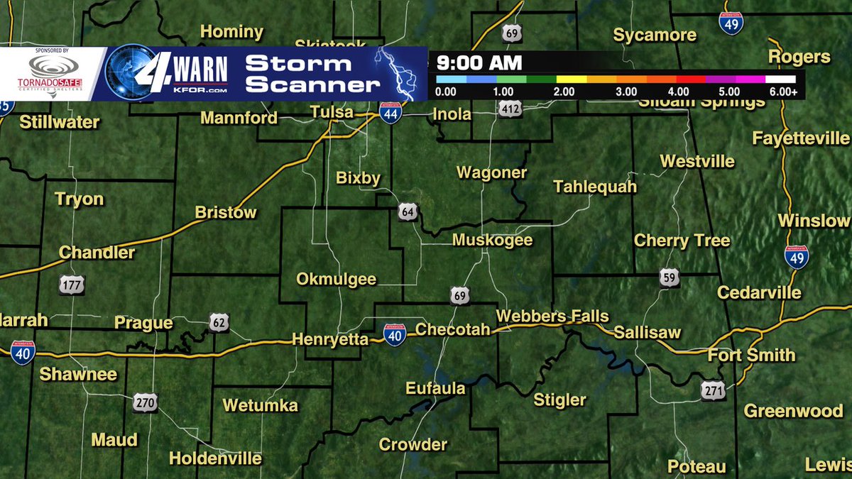The intense storm complex in NE OK is now building more southwest than west...and weakening a little. Watch for localized areas of flooding. This may graze the Metro...or stay just east. Most of the rain and storms will stay in eastern OK today. 9:13AM MON