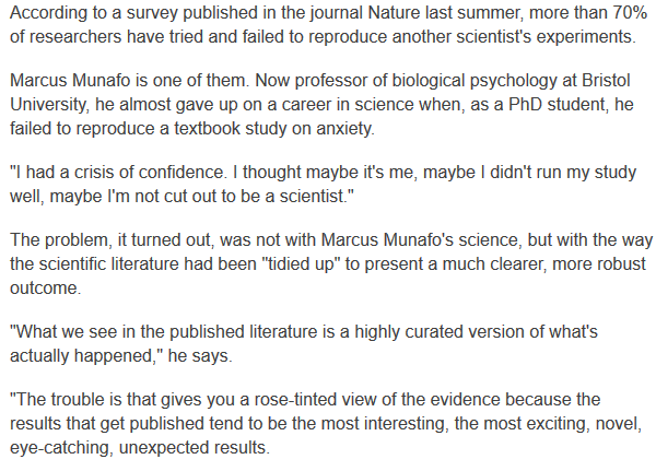 actually you're point is more than valid. It's one of the core implications of the replication crisis and it disproportionatley impacts early career researchers trying to build up on pblished work https://www.bbc.com/news/science-environment-39054778 …pic.twitter.com/xEppd3nQcn