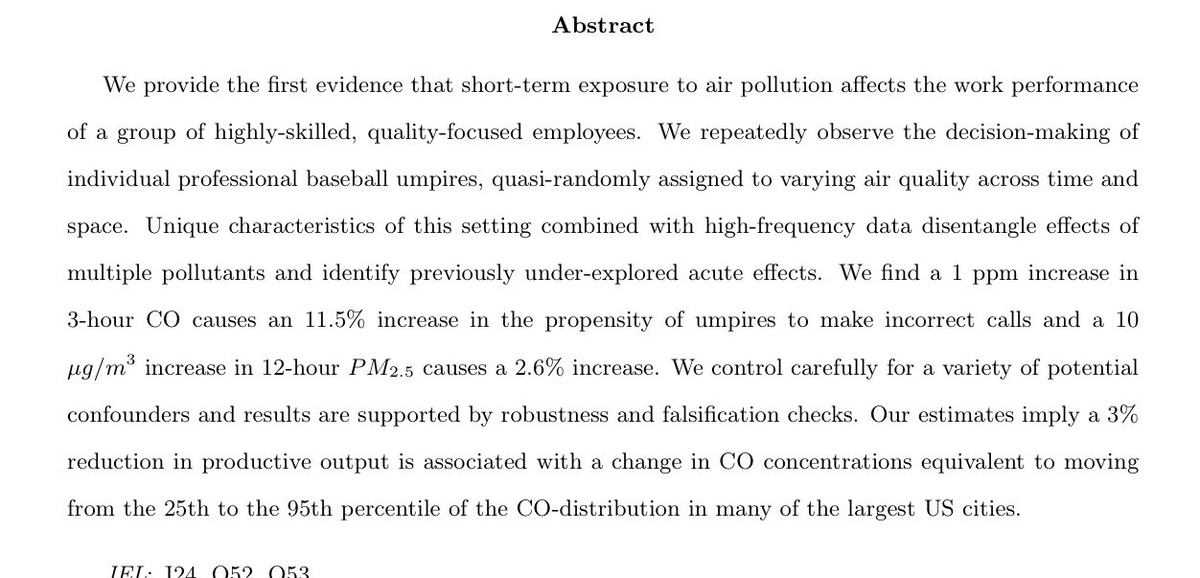 Pollution doesn't just hurt health: even short exposure to air pollution impacts your productivity & judgement. This paper looks pollution & bad calls by umpires finding big effects: a high pollution day in Phoenix or LA lowers productivity by 3%-12% over a low pollution day! pic.twitter.com/1s5KtQnW9T