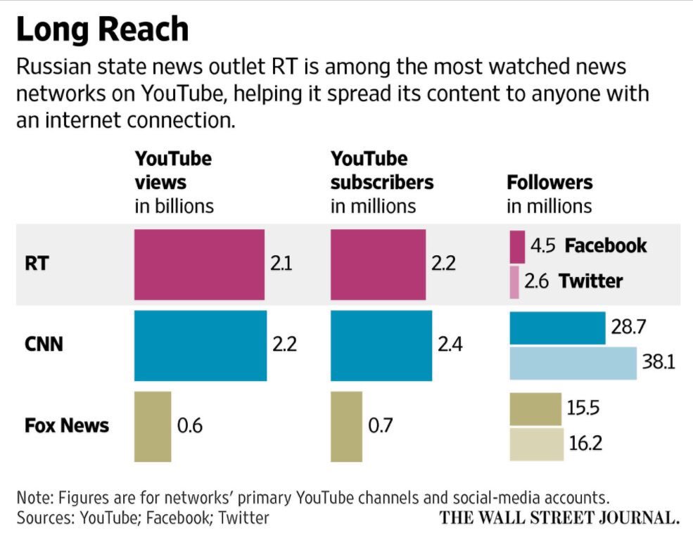 Russian propaganda outlet RT has a massive reach on YouTube compared to U.S. news outlets https://www.wsj.com/articles/russia-state-news-outlet-rt-thrives-on-youtube-facebook-1508808937 … pic.twitter.com/MTwKqu7SRR