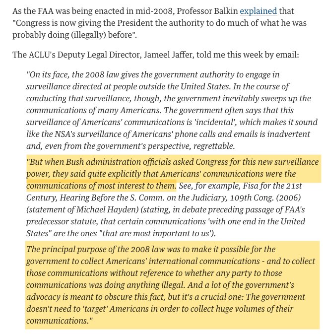 As @JameelJaffer has endlessly pointed out, advocates of 702 not only admitted in 2008 that it would enable large amounts of warantless surveillance of Americans, they admitted that was a *primary* purpose of the law @asharangappa https://www.theguardian.com/commentisfree/2013/jun/19/fisa-court-oversight-process-secrecy …pic.twitter.com/Oo0GnlIcYj
