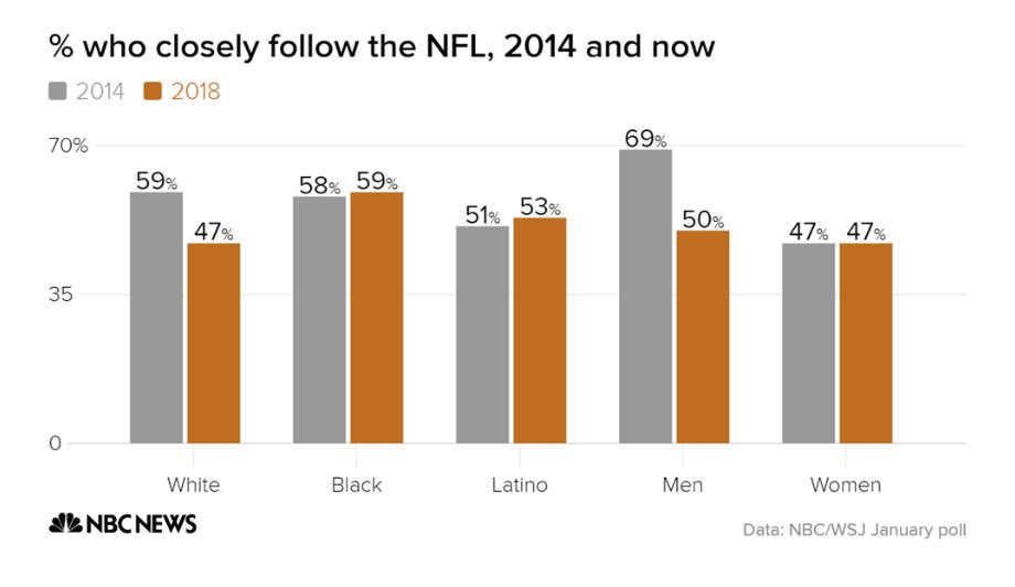 Also from NBC/WSJ poll: Those saying they closely follow NFL football has dropped 9pts since 2014 -- the decline coming almost exclusively from white men https://www.nbcnews.com/politics/first-read/poll-nearly-half-parents-would-discourage-football-due-concussions-n843836 … pic.twitter.com/1rcqOVQ36d