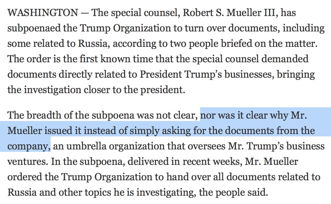 Would be nice to get specificity on the date of this Trump Org subpoena beyond "delivered in recent weeks"https://www.nytimes.com/2018/03/15/us/politics/trump-organization-subpoena-mueller-russia.html …