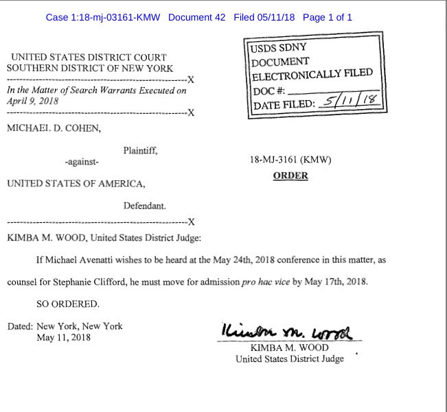 NEW: Judge Wood to Michael Avenatti: Respond to Cohen’s letter by May 17pic.twitter.com/E6hpCf6aWa