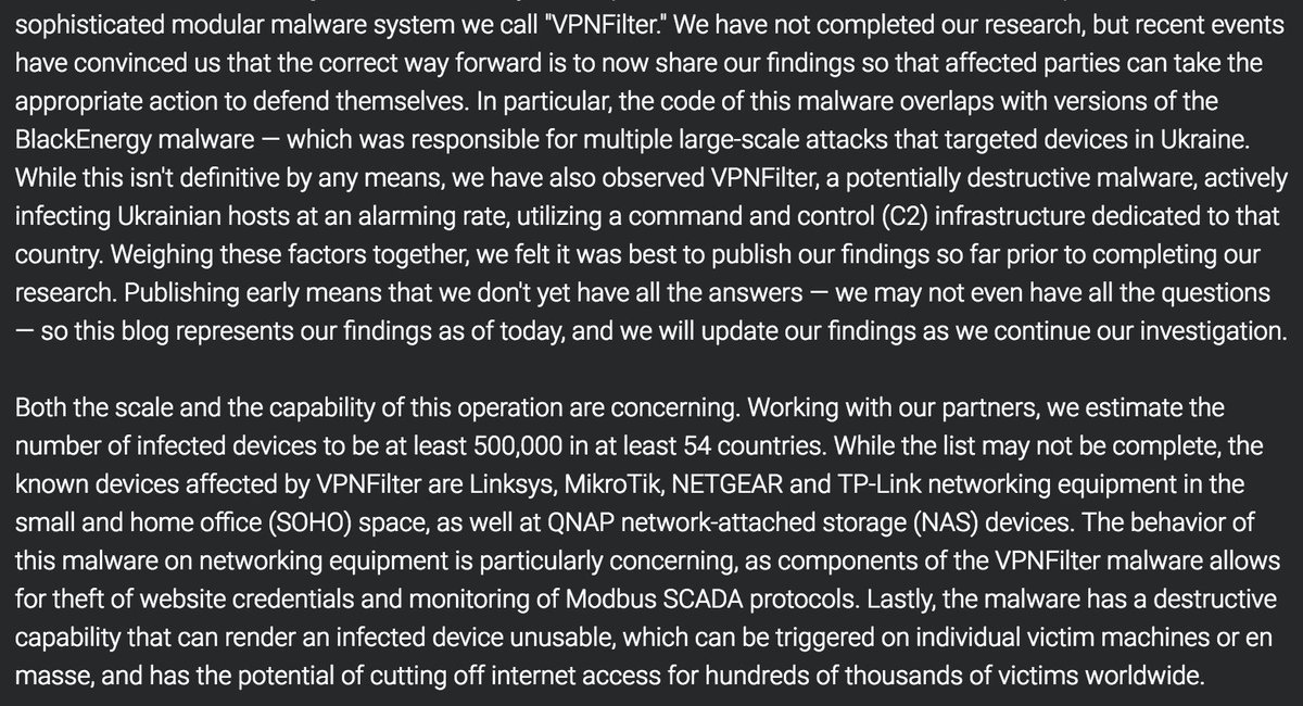 Cisco warns of new state-sponsored — likely Russian — cyber campaign targeting 500,000+ routers in more than 50 countries with "sophisticated modular malware": https://blog.talosintelligence.com/2018/05/VPNFilter.html …pic.twitter.com/ult4ARRUUj
