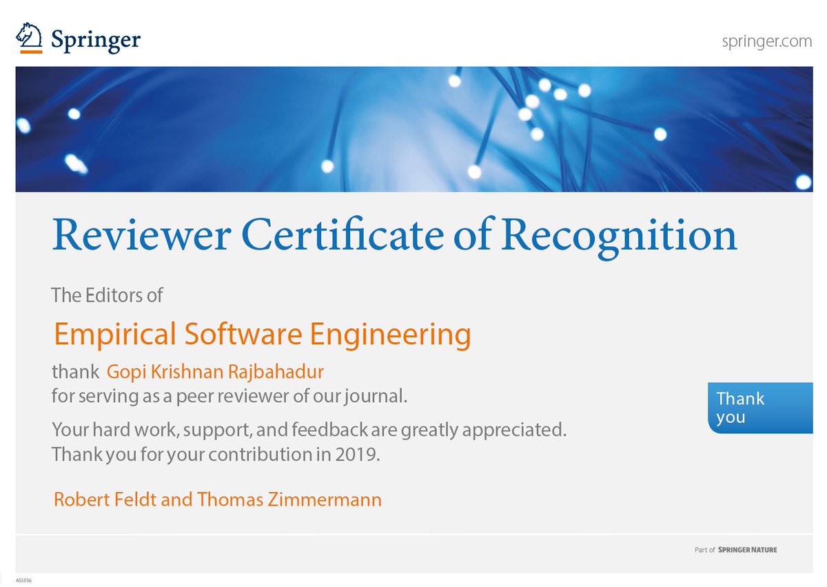 @emsejournal,@tomzimmermann ,@drfeldt! Really encourages the early career folks like me :) Look forward to reviewing (and writing) more papers for EMSE in the future :)pic.twitter.com/0l8ldAbEbP