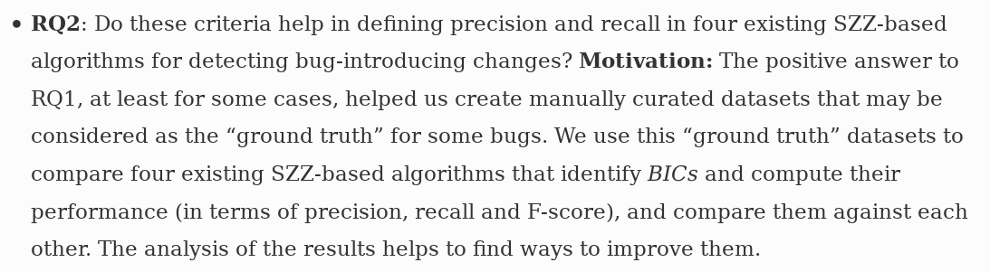 Then we explored how the model can help to define (and compute) precision and recall for different variants of SZZ, having into account how well they find changes to the code that caused a given set of (later fixed) bugs.pic.twitter.com/cD54D5pLZv
