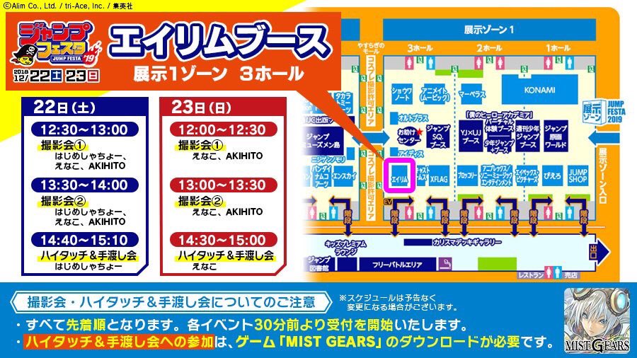 今日はジャンフェス2日目! 2日目も一緒に記念撮影できます! そしてハイタッチ&手渡し会もあるのでエイリムブースに遊びに来てね٩(๑❛ᴗ❛๑)۶pic.twitter.com/NmKP1NljgO