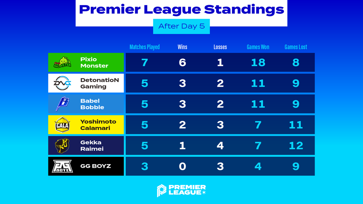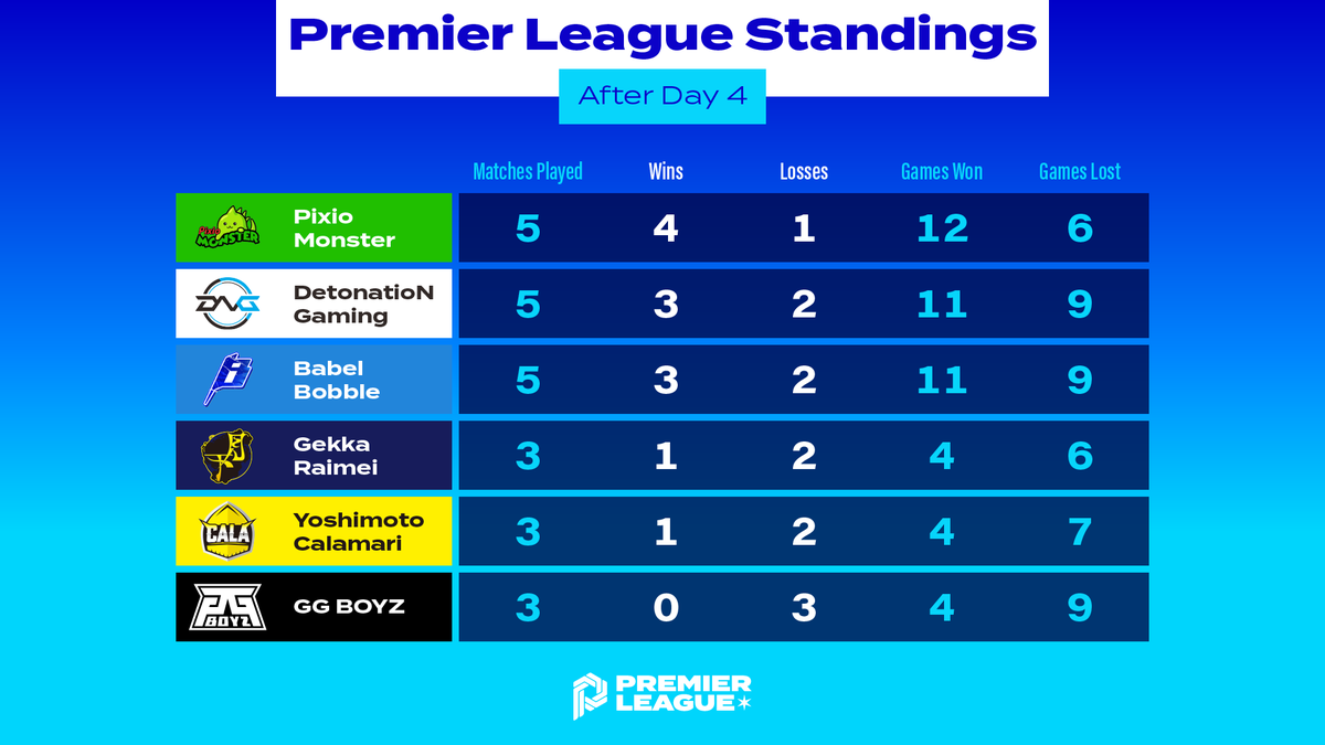 Day 5 will feature two matches apiece for GR, YC and PxM. Can Gekka Raimei or Yoshimoto Calamari make up ground? Can Pixio Monster—whose schedule is front-loaded with 7 games in the first half—build up a durable lead?pic.twitter.com/hk3HmHPwzi