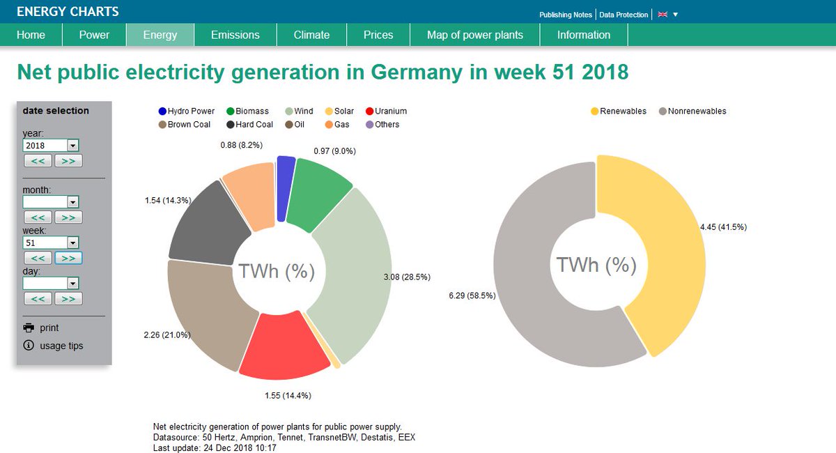 German net public power generation in week 49, 2018: 6.07 TWh renewable 5.31 TWh conventional 53.3% renewable share https://www.energy-charts.de/energy_pie.htm?year=2018&week=49 …pic.twitter.com/sgHx4TYgt2