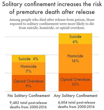 ANY instances of solitary confinement during one's prison sentence are correlated with higher rates of premature death after release. https://www.prisonpolicy.org/blog/2020/10/13/solitary_mortality_risk/ …pic.twitter.com/BlFowNIgqi
