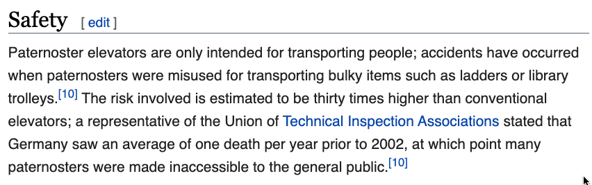 Wild. Never heard of these. Seems like I'm not the only one whose mind immediately went to safety. The stats don't sound as bad as I would have guessed, but I guess they're bad enough for some places. https://en.wikipedia.org/wiki/Paternoster …pic.twitter.com/cgfBjJ8ZY7