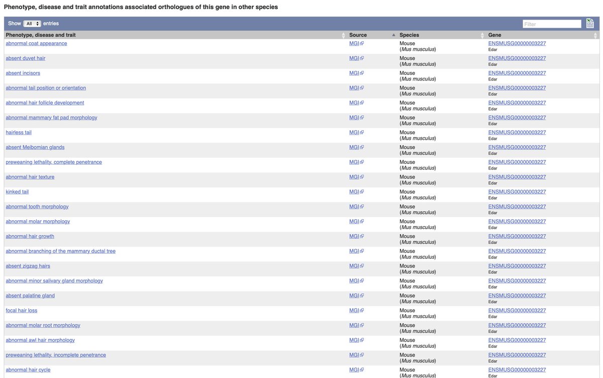 #gene tab to explore phenotypes, diseases and traits associated with#geneoftheweek EDAR, its variants and orthologues. Mouse#orthologue of this gene has been linked to many#hair traits. https://buff.ly/2uxC8wO https://buff.ly/2tI7UHn pic.twitter.com/OX9NTSQm0H