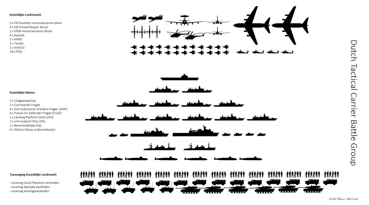 Na alle eisen en wensen. Opgeteld: - 2 vliegdekschepen - 24 'Multi purpose' fregatten - 12 Onderzeeërs - 48 x F35c - 8 extra Reapers - 4 MQ4 - 4 P8 Poseidion's Alleen maar bescheiden aandacht voor Landmacht... Weekend eens kijken wat dit bij benadering zou kosten