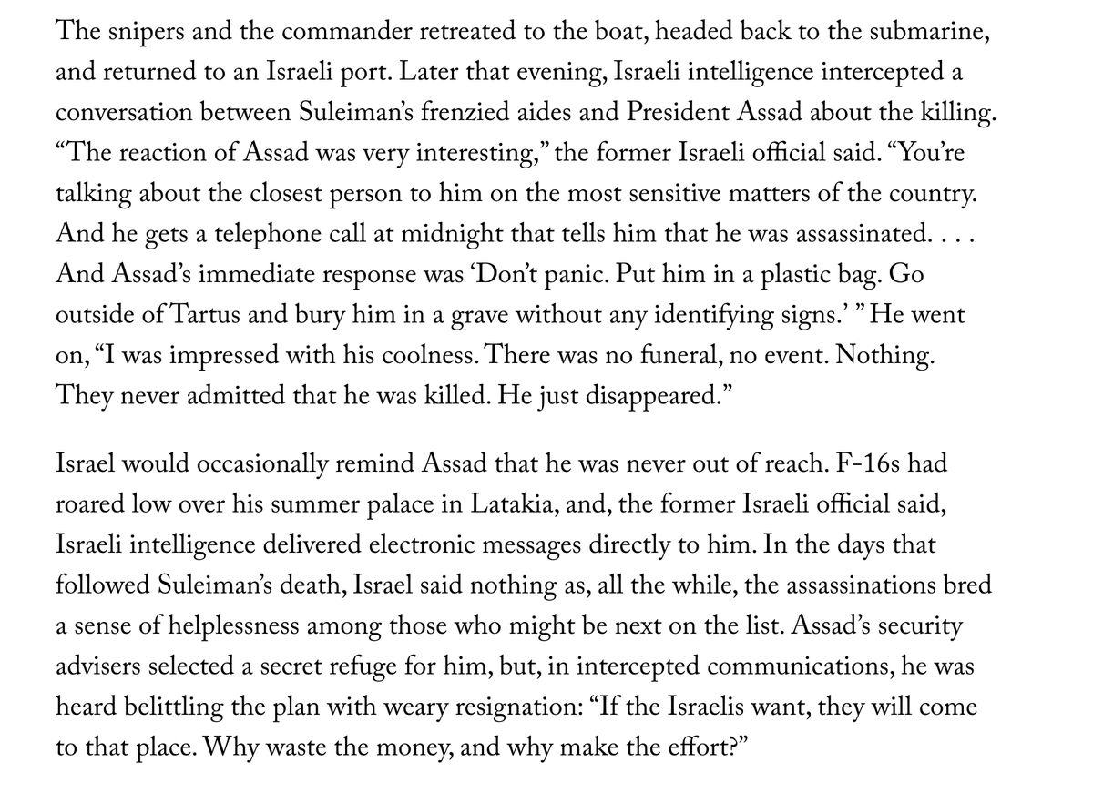Among the great tidbits in this Adam Entous/Evan Osnos piece on how assassinations happen: Mossad pings Assad every once in a while to remind him he's only human https://www.newyorker.com/magazine/2020/02/10/qassem-suleimani-and-how-nations-decide-to-kill …pic.twitter.com/wSMHYTvDJL