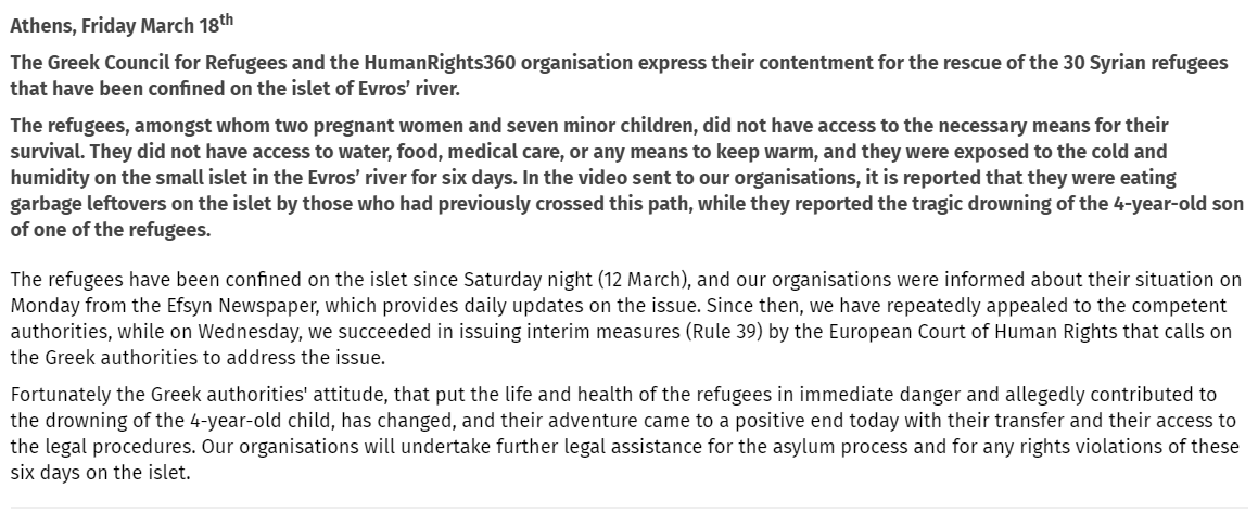 @rights360 applied for Rule 39 measures, granted by ECtHR. A 4-year-old has reportedly drowned. The Supreme Court ordered the Orestiada prosecutor to investigate possible criminal liability of the authorities. Any legal action would be a miracle, though.https://twitter.com/lk2015r/status/1504525957276831749 …Show this threadThanks. Twitter will use this info to make your timeline better. UndoUndo -