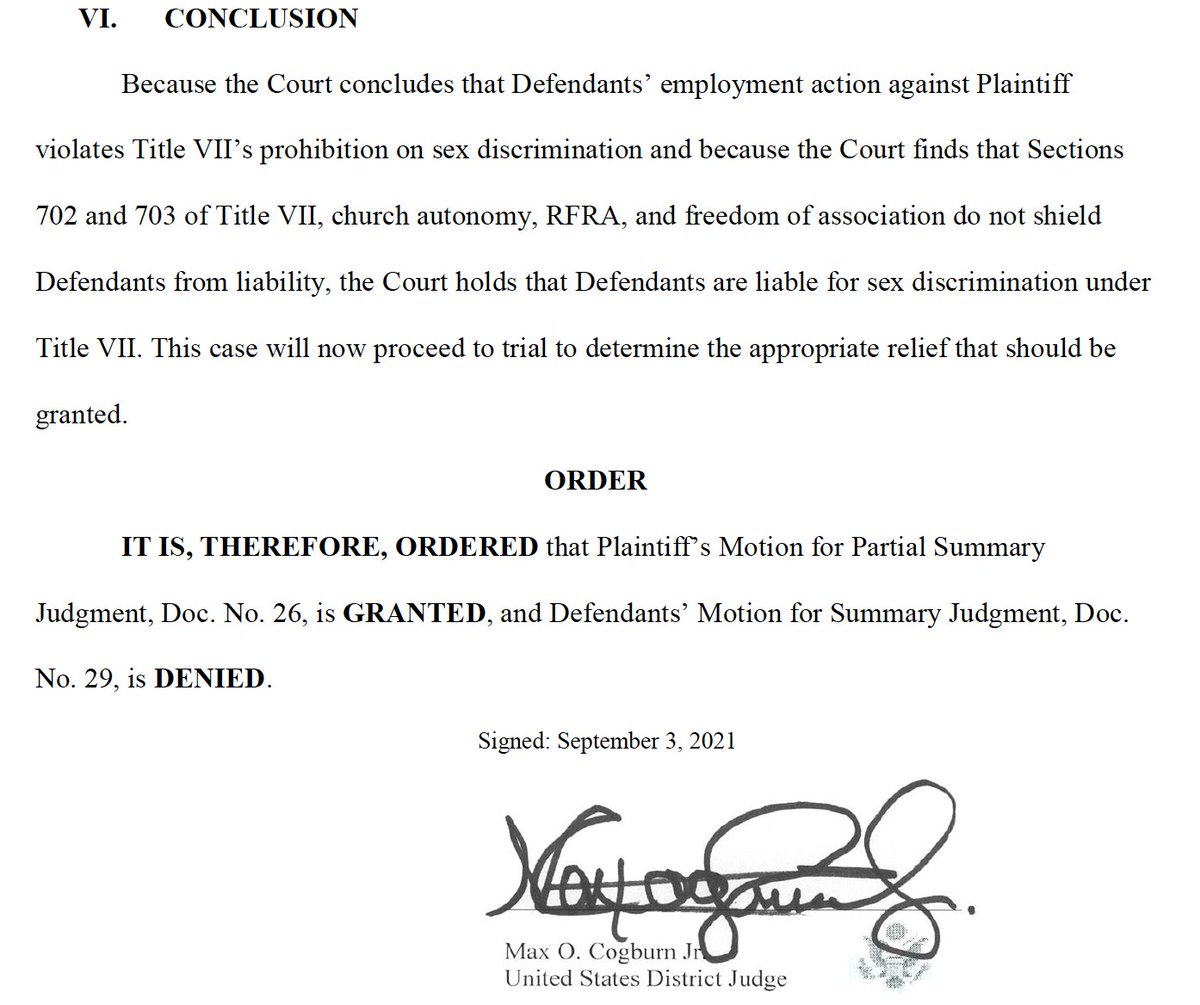 North Carolina fed judge rules in favor of former Catholic school teacher fired after announcing on Facebook that he would be marrying his long-time partner. Judge Cogburn's Findings and Conclusions here: http://files.eqcf.org/cases/317-cv-00011-69/ …