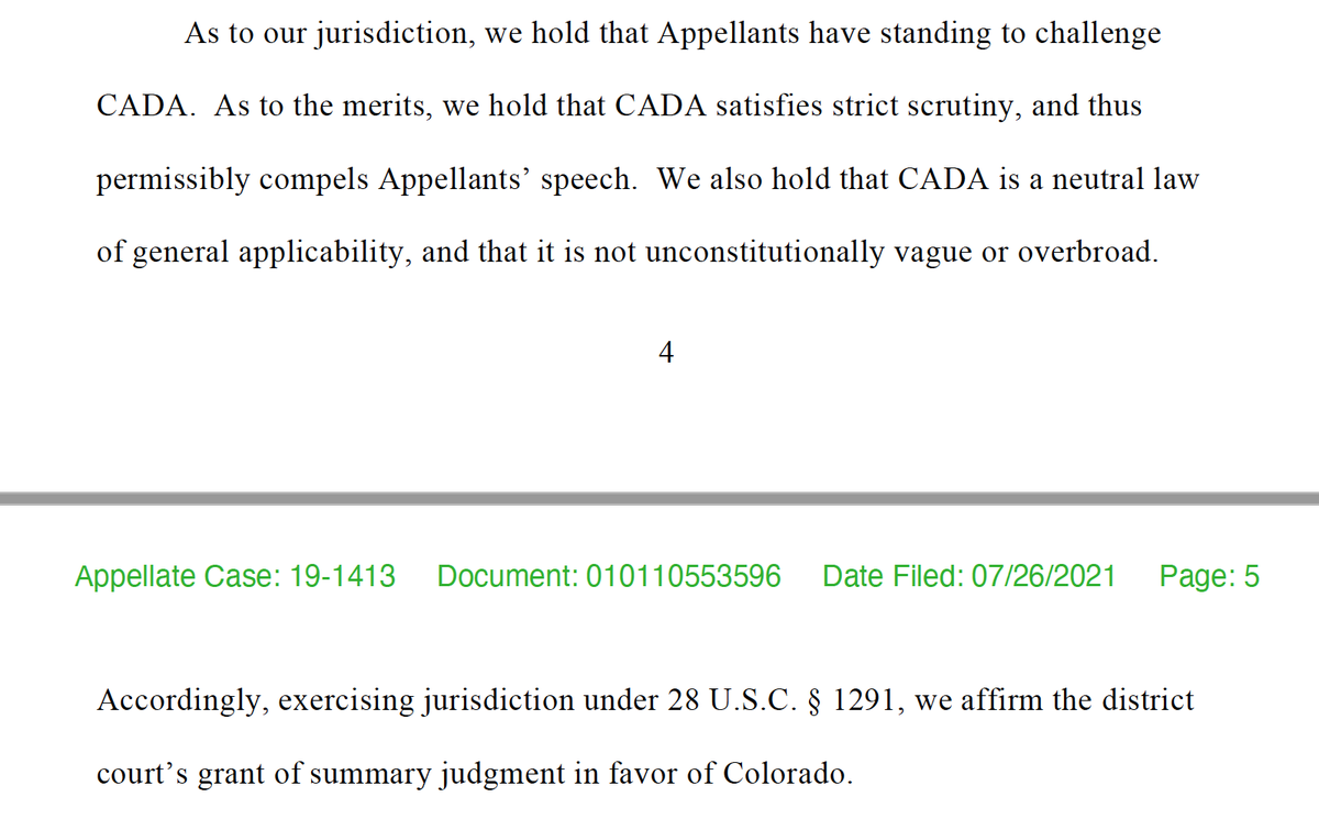 The Act "satisfies strict scrutiny, and thus permissibly compels Appellants' speech." It "is a neutral law of general applicability, and ... is not unconstitutionally vague or overbroad."pic.twitter.com/2nnLMdlYhZ