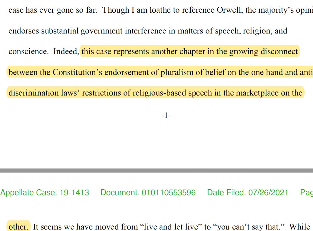 Judge Tymkovich's dissent begins pg 52. "... this case illustrates exactly why we have a First Amendment. Properly applied, the Constitution protects Ms. Smith from the government telling her what to say or do."pic.twitter.com/MZl3Q8EgD5