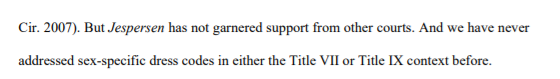 There’s a lot of important stuff on Title IX here. The panel casts doubt on Jespersen, the maligned Ninth Circuit opinion holding that women can be forced to wear makeup to work while men are not. 3/pic.twitter.com/Doy7Vs3JoQ