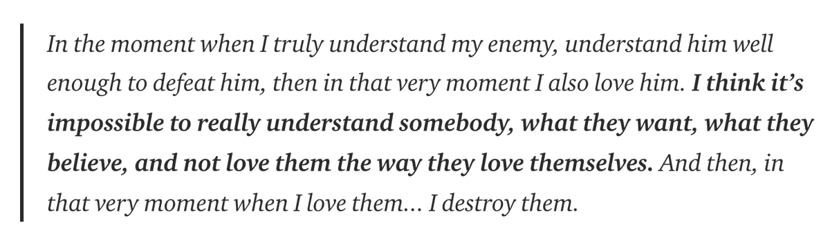 To love someone isn't the same as agreeing with them. Good articulation of this idea comes from fictional character Ender Wiggins, from Orson Scott Card's "Ender's Game" https://medium.com/the-badlands/enders-game-loving-your-enemy-4ece4d766243 …pic.twitter.com/lnmpE9AdWd