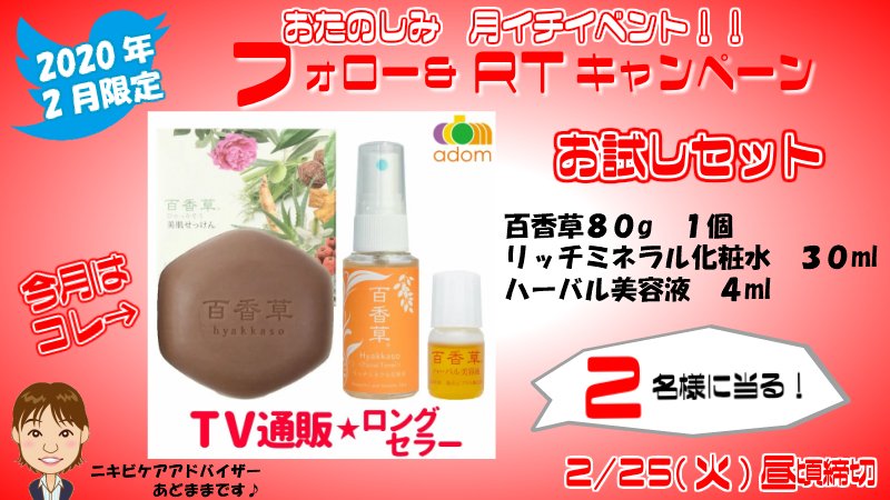 【おたのしみ★月イチイベント】石鹸はなんとレギュラーサイズ★フォロー&RTキャンペーン!《ニキビ肌・敏感肌に》アドム入門セット※4000円相当が2名様に当る! ★応募方法 このツイートをフォロー&RT(リツイート) ※2/25(火)昼頃締切&当選DMご連絡