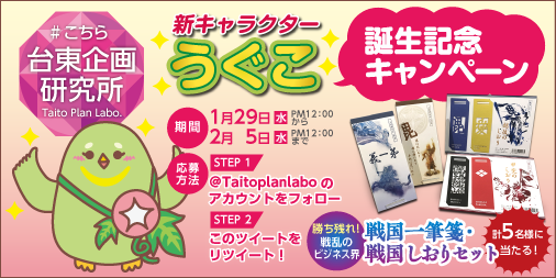 台東企画研究所の新キャラクター『うぐこ』の誕生を記念して、当社オリジナルの戦国一筆箋と戦国しおりのセットを5名様に #プレゼント いたします