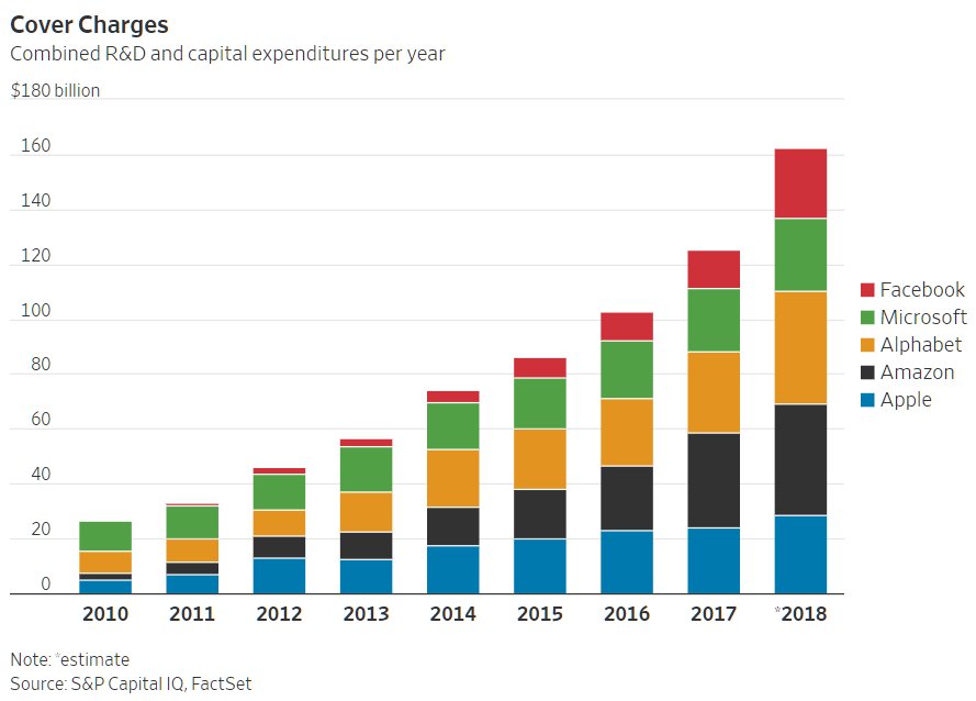 "Big Tech’s Growth Comes With a Big Bill" Apple, Amazon, Google, Microsoft & Facebook 2018: revenue growth: +21% R&D: +24% Capex: +48% https://www.wsj.com/articles/big-techs-growth-comes-with-a-big-bill-1531819800 …pic.twitter.com/Cf09qYv61U