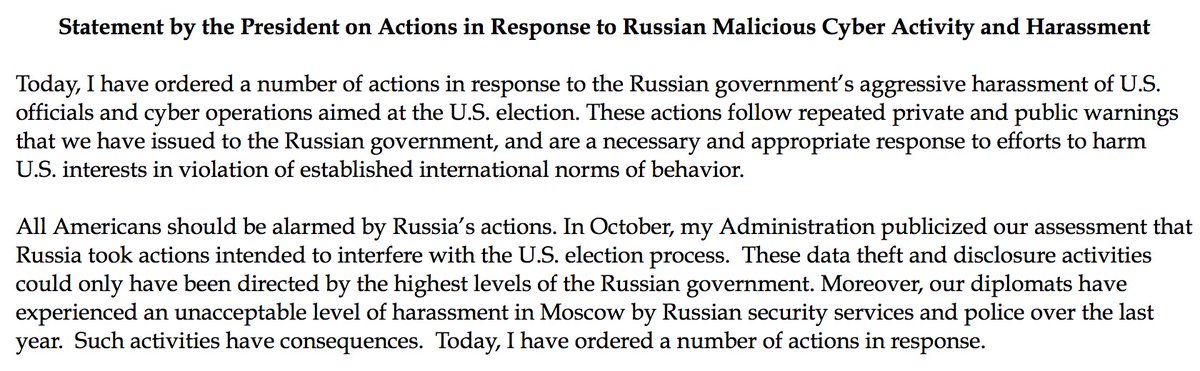 Obama, in just-released statement, says, "These actions are not the sum total of our response to Russia’s aggressive activities."pic.twitter.com/8pA72Dxj9Z