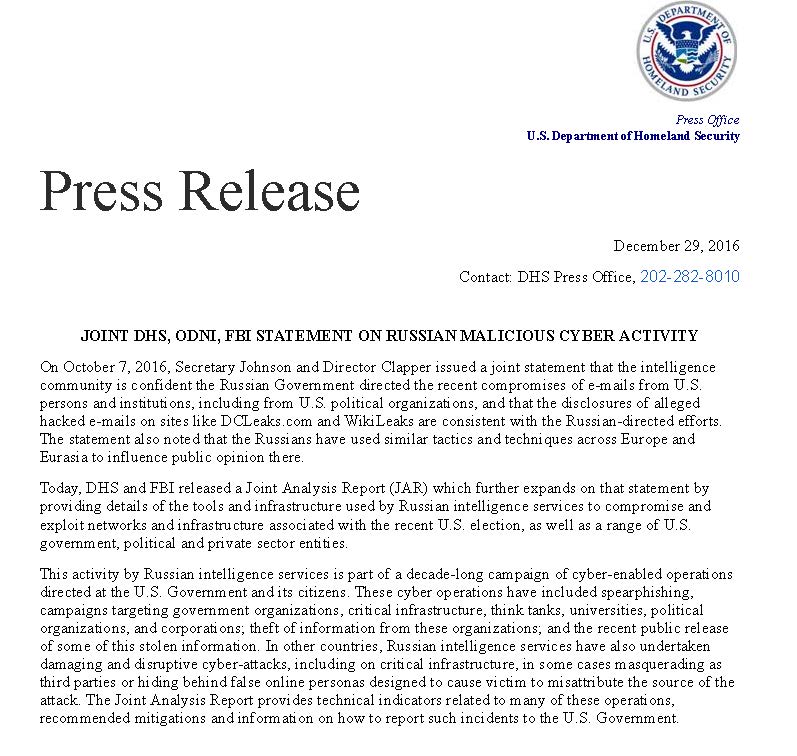 DHS has also released a list of technical indicators that suggest a Russian hack. https://www.us-cert.gov/security-publications/GRIZZLY-STEPPE-Russian-Malicious-Cyber-Activity …pic.twitter.com/7o0nkjcNNr