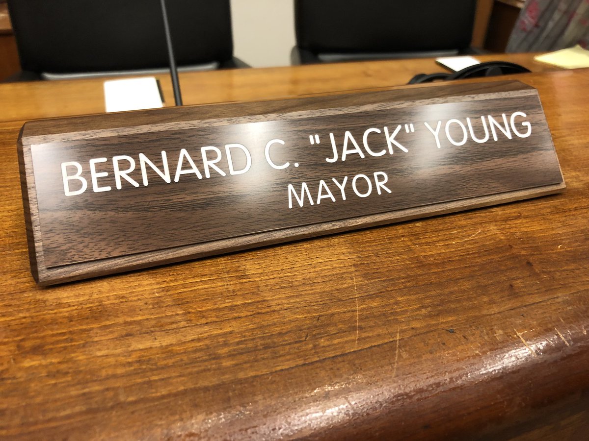 New name plate just put up at Board Of Estimates for Jack Young. 1st time the name plate has said “Mayor”.
