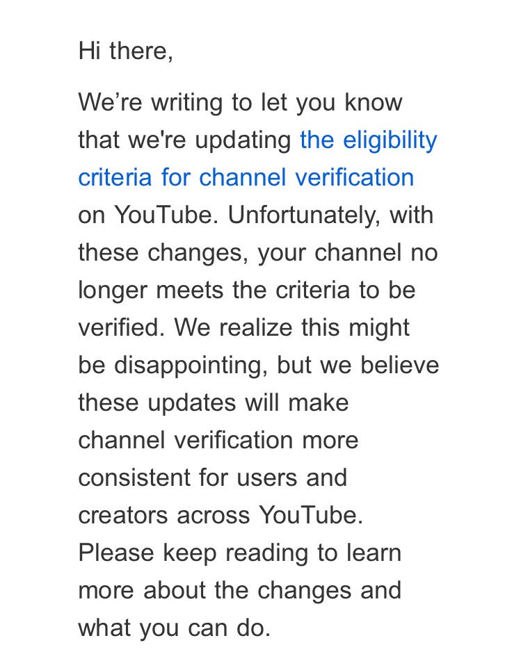 Great news. Not only did YouTube demonetize me multiple times, but now they are taking the verification away from my channel. All 3 years of my hard work and dedication is being taken away from me. Unreal.pic.twitter.com/59ePlWf74a