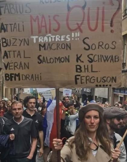 Affiche antisémite déployée samedi dernier à la manifestion de Metz. Ce matin nous sommes tous des juifs allemands vaccinés.