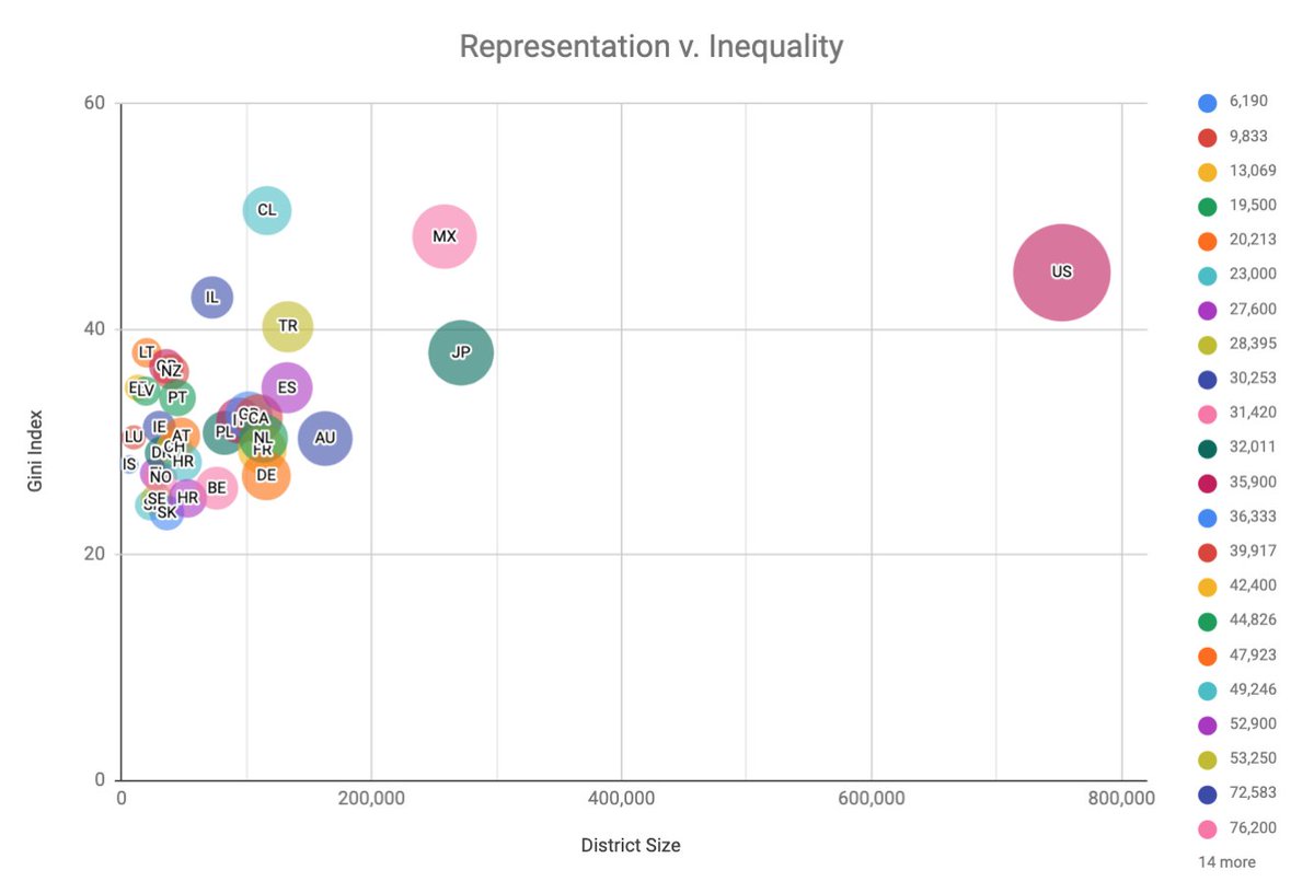 Exploring some data and find this telling. Of the 36 OECD nations, the US has the worst representation (avg district population is 758k in the US, whereas many OECD nations have 1 lawmaker representing <100k) and near the bottom wrt inequality. #inequality #democracy #Congresspic.twitter.com/vdphvZufO2