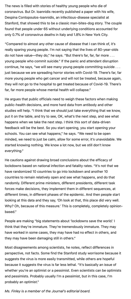 “There’s some sort of mob mentality here operating that they just insist that this has to be the end of the world, and it has to be that the sky is falling."—John Ioannidis Not exactly; most of us believe in distancing/lockdowns and #COVID19 CFR ≠ flu https://www.wsj.com/articles/the-bearer-of-good-coronavirus-news-11587746176 …pic.twitter.com/JvomILpL6s
