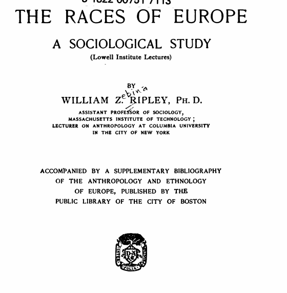 Note particularly his citation here of one Ripley. That "Ripley" is actually William Ripley, one of the most notorious race scientists of the modern era, whose book *The Races of Europe* had a profound influence on scientific racism in the 20th century. 4/10pic.twitter.com/tafJjPZKXV