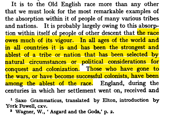 Shore saw himself explaining the modern "Anglo-Saxons" prowess of colonization, in part through the "vigour" the received from absorbing "people of other descent," including those of the "darker races" of Europe. 9/10pic.twitter.com/IVOfYqy2Nx