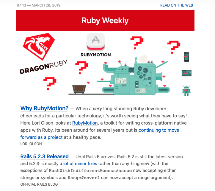 This issue of Ruby weekly has a special section "A Countdown to Rails 6 in New Features" featuring Rails 6 series blogs by the BigBinary team.