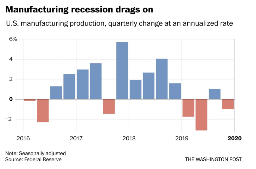 US manufacturing was in a recession in 2019, according to Fed data out today. Output declined last year. Job growth slowed sharply. Job openings fell 32% since July. It's the sore spot in the US economy https://www.washingtonpost.com/business/2020/01/17/us-manufacturing-was-mild-recession-during-2019-sore-spot-economy/ … w/
