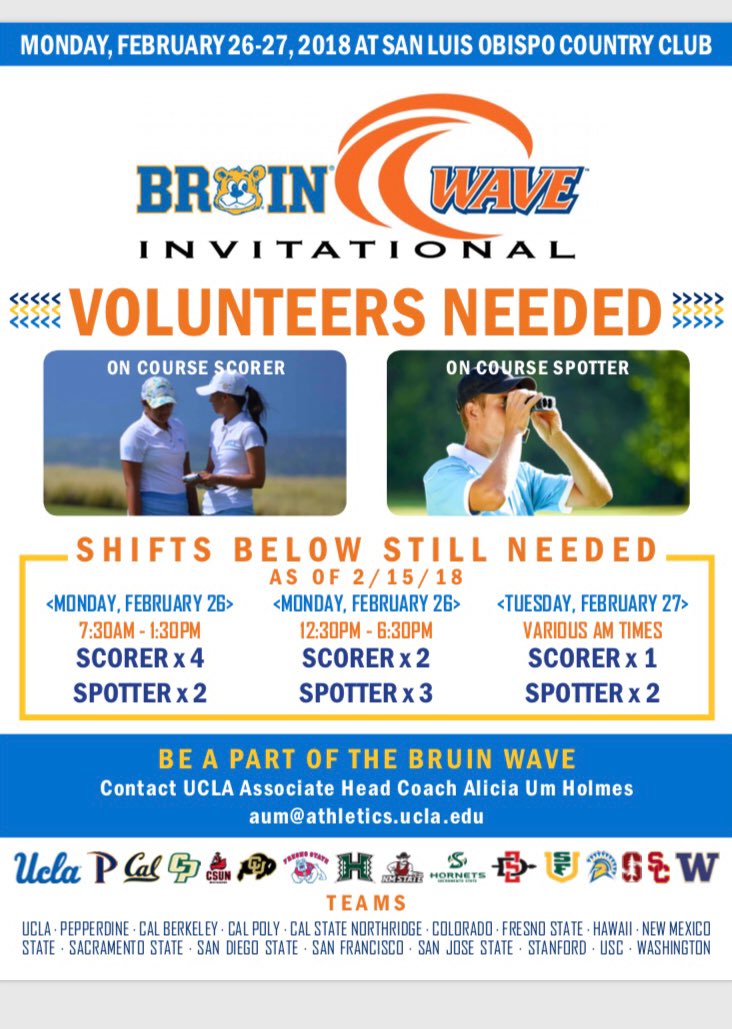 Bruins, can we get a retweet? Looking for volunteers for our home tournament at San Luis Obispo CC February 26th & 27th. To sign up, email: aum@athletics.ucla.edupic.twitter.com/HHNzhNG653