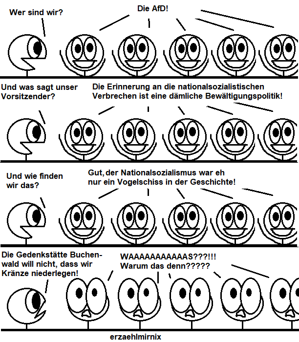 Super-trefflich-zutreffend dargestellt, wie die AfD drauf ist bzgl. Verharmlosung (und auch Nachahmung) ihrer ~Vorbildpartei und von deren Initiation der Gräueltaten des 3. Reiches! Chapeau nebenbei an die wohlbegründete Courage der Gedenkstätte Buchenwald bzgl. Täter-Ideologen.